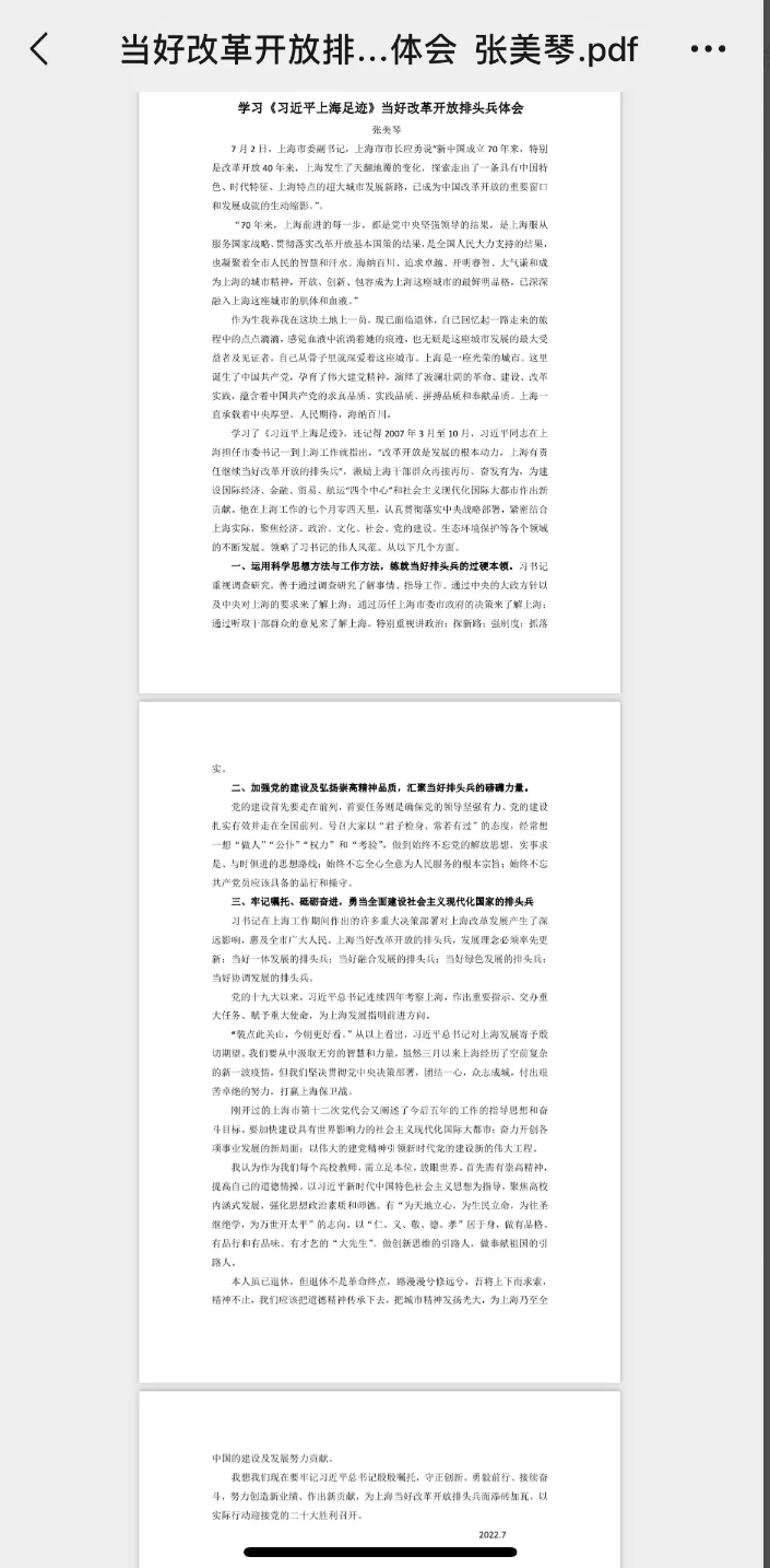党的二十大是一个令人激奋的大会,总书记的报告令人振奋、鼓舞人心!初步学习党的二十大报告,我体会最深的两点是:坚持人民至上和要办好让人民满意的教育。第一,我们党的根基和血脉在人民,紧紧依靠人民、不断造福人民,是党的理想信念、性质宗旨、初心使命,党的领导干部在实际工作中,必须求真务实,切实做到为官一任、造福一方、心安理得。第二,总书记报告中说要办好人民满意的教育,落实立德树人根本任务,习近平总书记说出了我们教育工作者的心声。我作为入党近50年的老党员、35年教育工作者,虽已退休多年,但退休不褪色,继续关心支持、全心助力上海健康医学院的教育事业发展义不容辞!我将把深入学习贯彻党的二十大精神作为当前和今后一个时期的首要政治任务,继续为讲好健康故事、传播健康声音、落实立德树人根本任务发挥老党员领导干部的职责和余热!