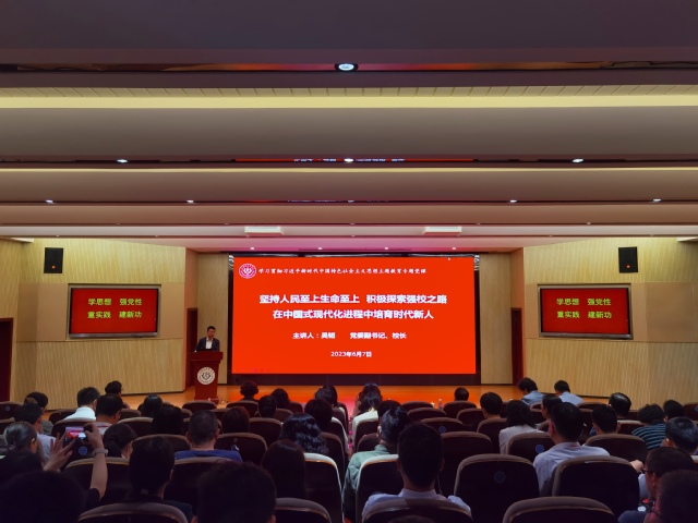 吴韬结合学校办学特色和目标定位,从“教育是国之大计、党之大计”的战略高度,着眼中国式现代化进程中培育时代新人的使命任务,围绕“中国式现代化建设探索历程和特征、强化中国式现代化建设的人才支撑和争做新时代具有硬核实力的好干部”三个方面展开,结合案例、数据和影像资料理实结合、深入浅出,带领师生沉浸式学习了中国式现代化的中国特色、本质要求、重大意义,深刻体会领悟习近平总书记关于中国式现代化、新时代教育科技人才强国等重要讲话重要论述精神。