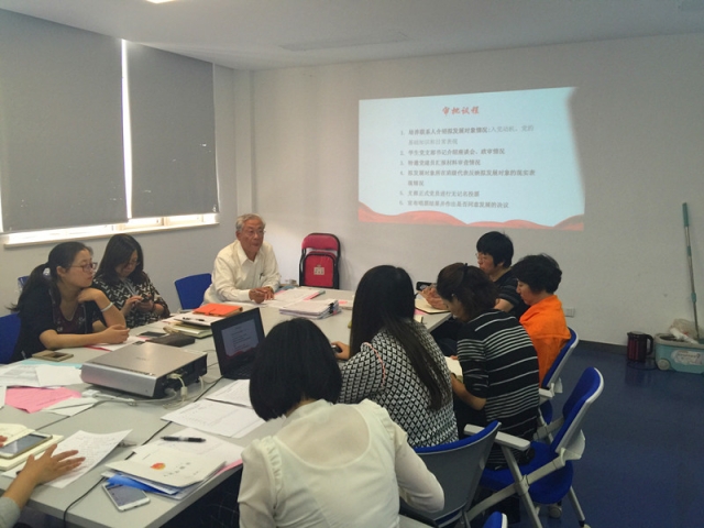 第二部分,邵真如汇报了拟发展对象的学生座谈会和政治审查情况,并请特邀党建员傅向东老师汇报材料审查情况。药学院党总支书记徐一新和副书记叶婧老师参与了整个预审会,并提出学生党员发展是重要的事情,要注重同学们的学习成绩和未来发展,多提同学们身上存在的不足之处,帮助他们进步。