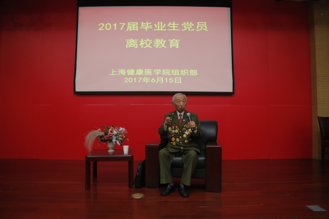 6月15日,已经86岁高龄的原“沙家浜”部队老兵,现任上海新四军“沙家浜”部队历史研究会会长的刘石安少将受邀来到我校200人报告厅,为毕业生党员上了一堂深入人心的党课。他围绕“两学一做”专题,用“旗子、镜子、尺子”作比,以亲身经历讲述了那个年代共产党员的信仰与坚守:冲锋在前、视死如归的指导员;为了守住阵地冻死战场,冻僵的身躯保持射击姿势的180团2连;在抗美援朝战场上英勇作战,不惧严寒饥饿连续作战的志愿军20军……共产党员的先进性在革命先辈们的身上如此鲜活,深深感动了在场120余名即将走上社会的学生党员。“信仰的旗帜不能丢,要勇于担当,作出成绩,回报社会”,刘老用这句话作为总结,并寄语毕业生党员们常怀感恩之心,不忘党员身份。