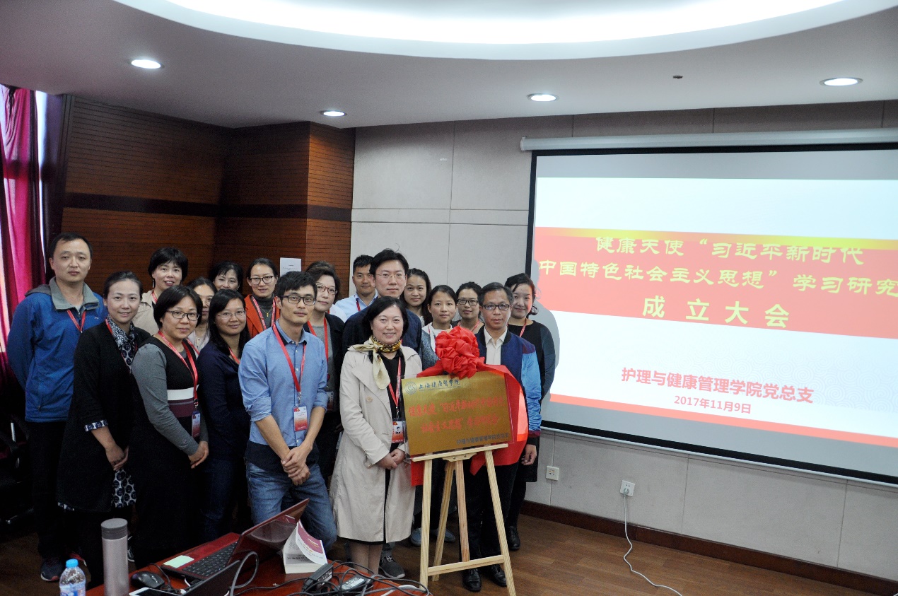 11月9日,护理与健康管理学院在浦东校区北苑9号楼808举行健康天使“习近平新时代中国特色社会主义思想”学习研究会揭牌仪式。护管学院党政领导、各支部书记、总支委员、民主党派教师代表、教职工代表共同见证了学习研究会的成立。