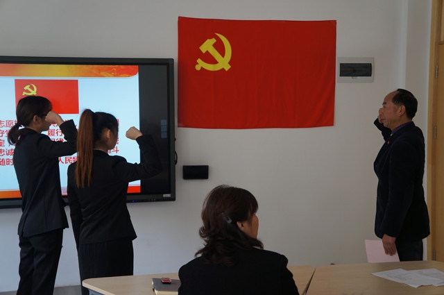 《入党宣誓仪式》将此项活动推向高潮,由党龄最长的康复学院党总支副书记王涌老师领誓,14级康复治疗技术专业的2名预备党员丁聿珺、周依婷同学向党旗宣誓,2位同学怀着无比激动的心情,纷纷表示我们即将从学校走向社会,我们会时刻铭记党员的标准,带领好班级同学顺利找到满意的工作岗位,在岗位上全心全意为患者服务,时刻反省自己,提醒自己,认识错误,改正错误,争取按时转正,成为一名正式的共产党员。(康复学院)